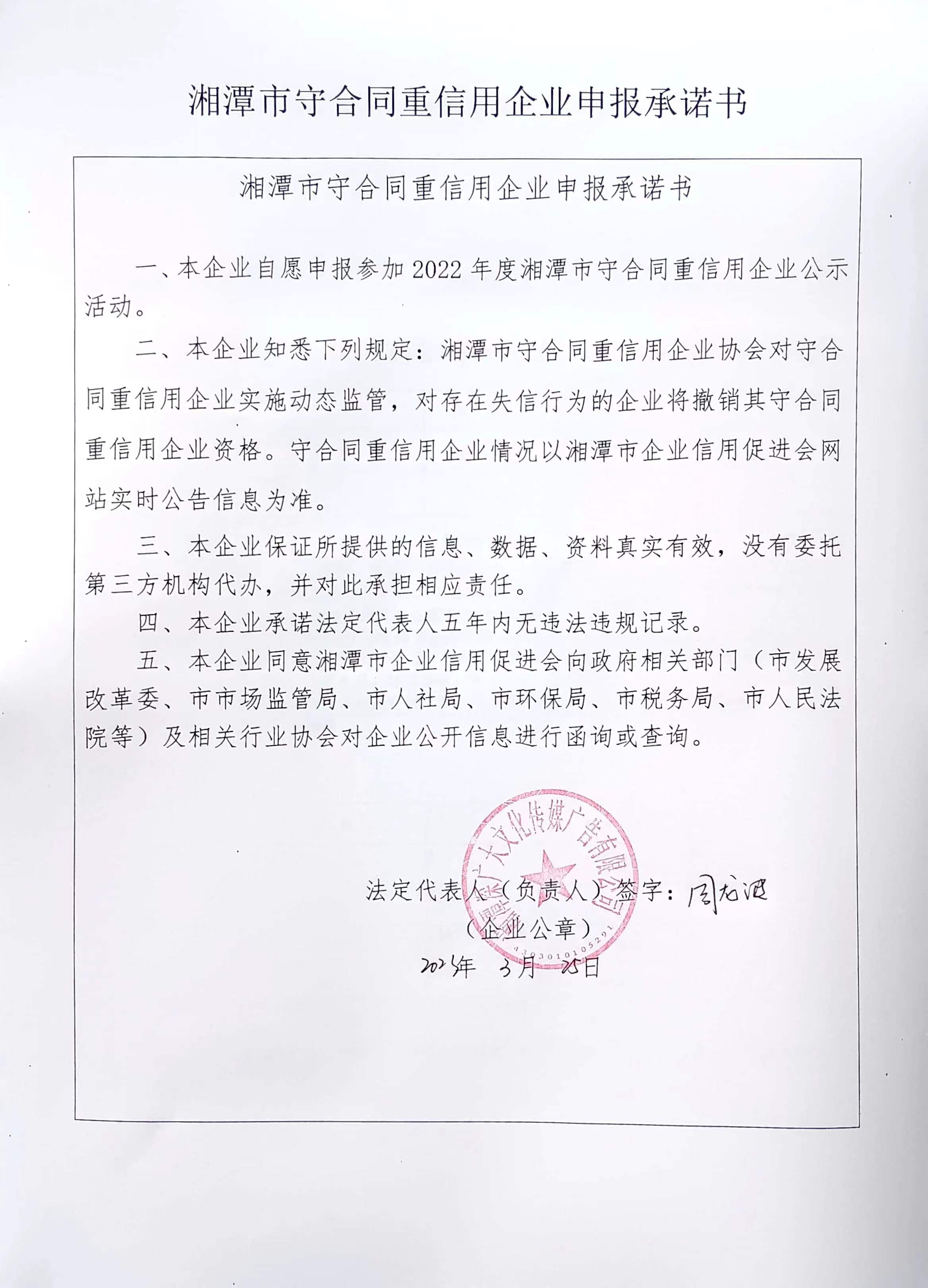 本企業(yè)根據(jù)《湘潭市守合同重信用企業(yè)申報規(guī)定》等編制 2022 年度企業(yè)信用報告書,并保證本報告書內(nèi)容真實(shí)、準(zhǔn)確、完整。